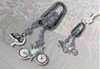 dwie zawieszki w kształcie roweru i kasku zawieszone na wytrzymałej linie nylonowej