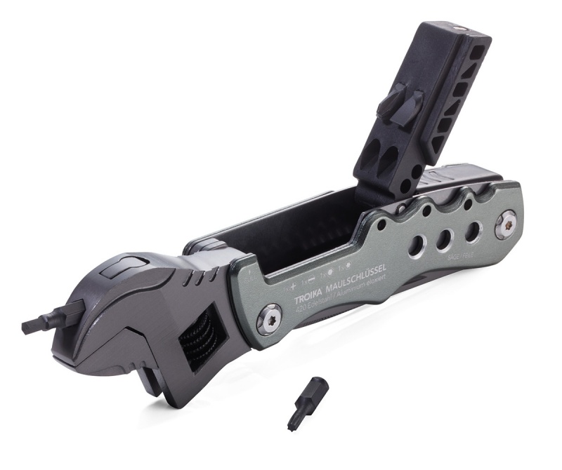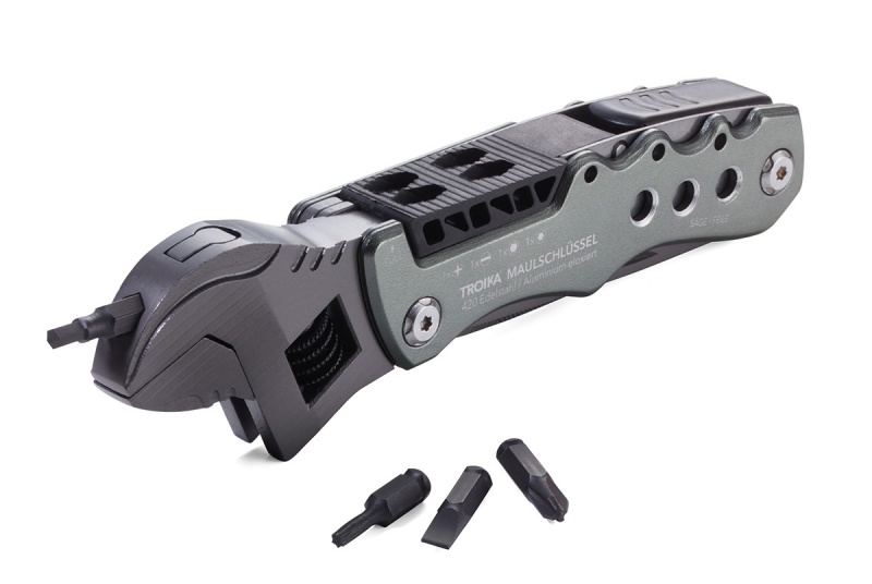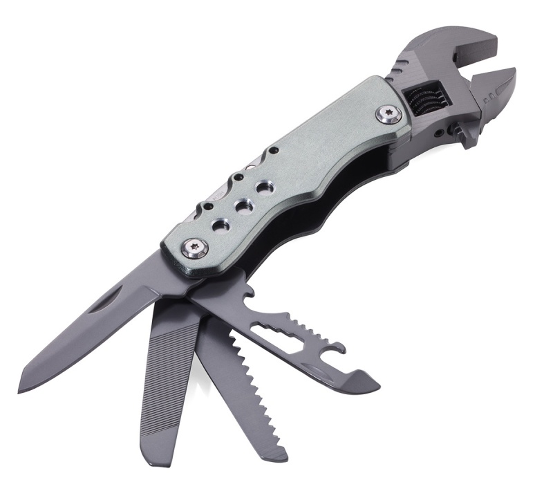 12 funkcji: klucz nastawny (angielski), nóż, piła, pilnik, otwieracz do butelek, otwieracz do puszek, szeroki śrubokręt płaski, klucz sześciokątny (4 rozmiary), 4 końcówki do narzędzia (płaska, krzyżakowa, nasadowa, sześciokątna)
