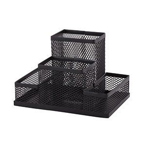 - Metalowy, czterokomorowy przybornik na biurko powleczony czarnym lakierem.